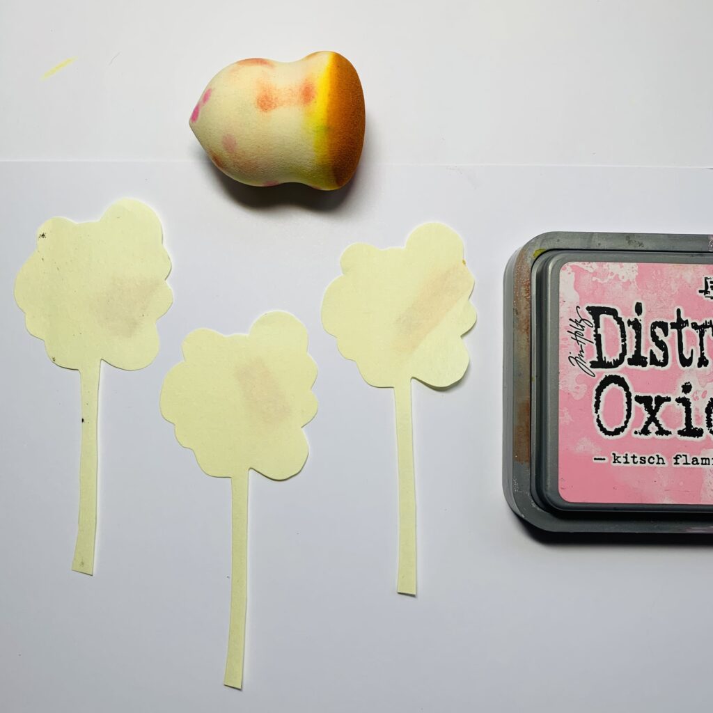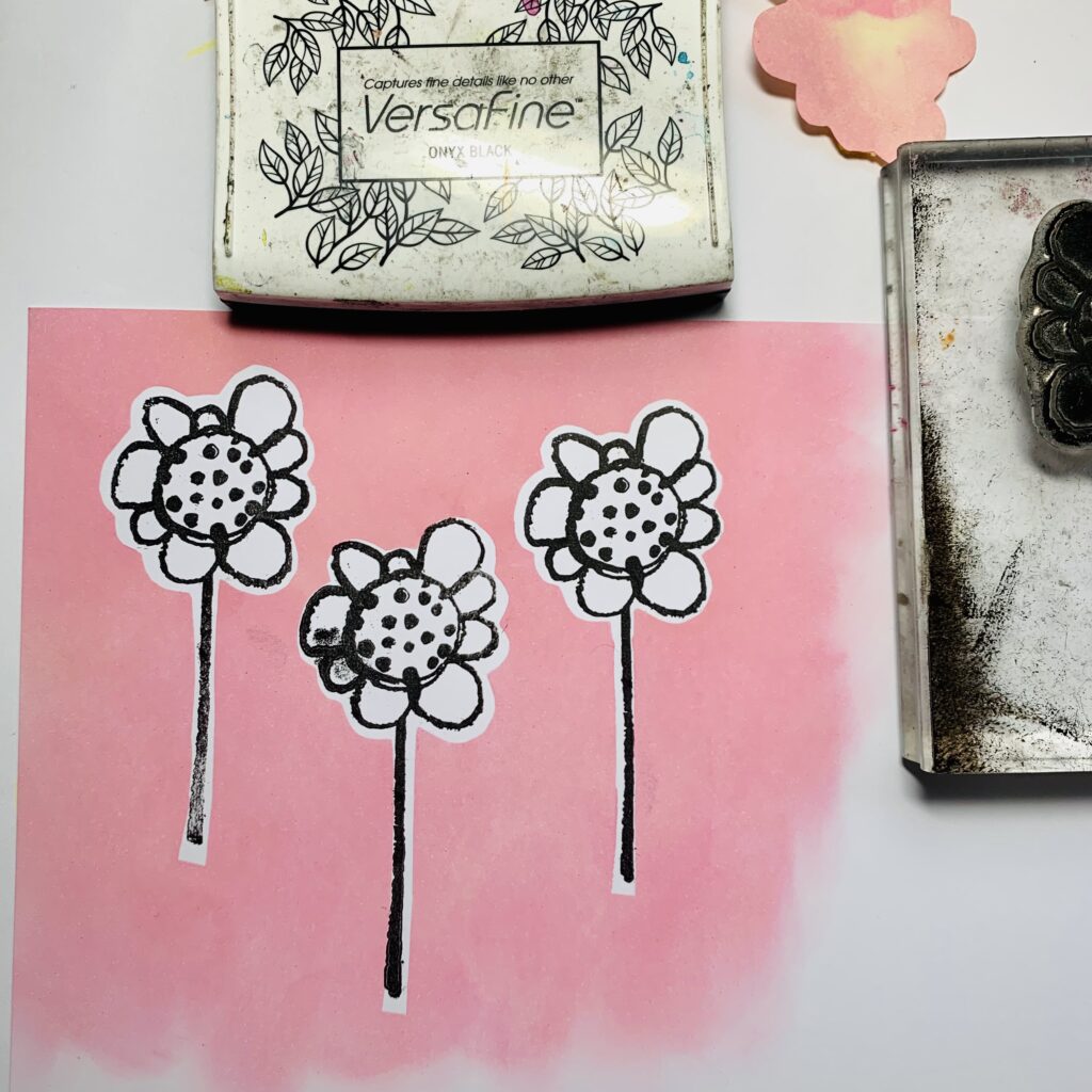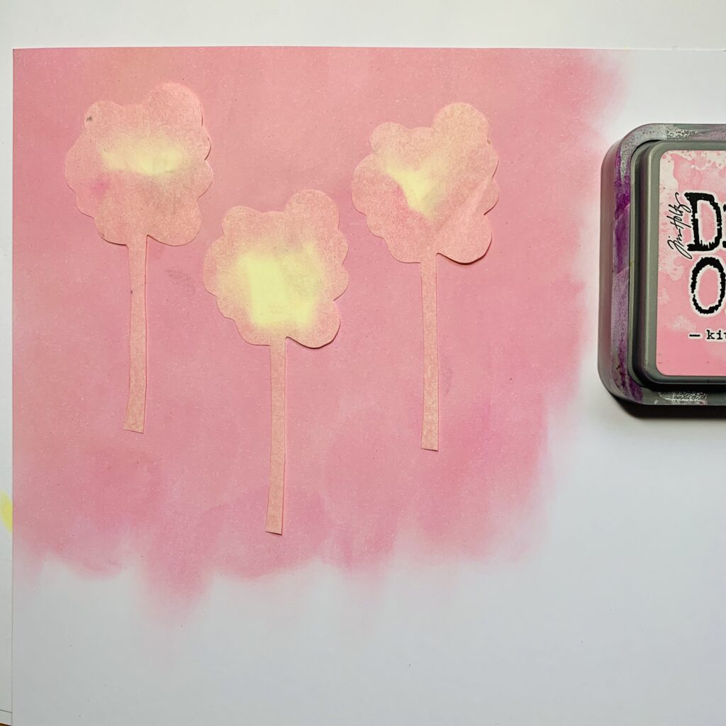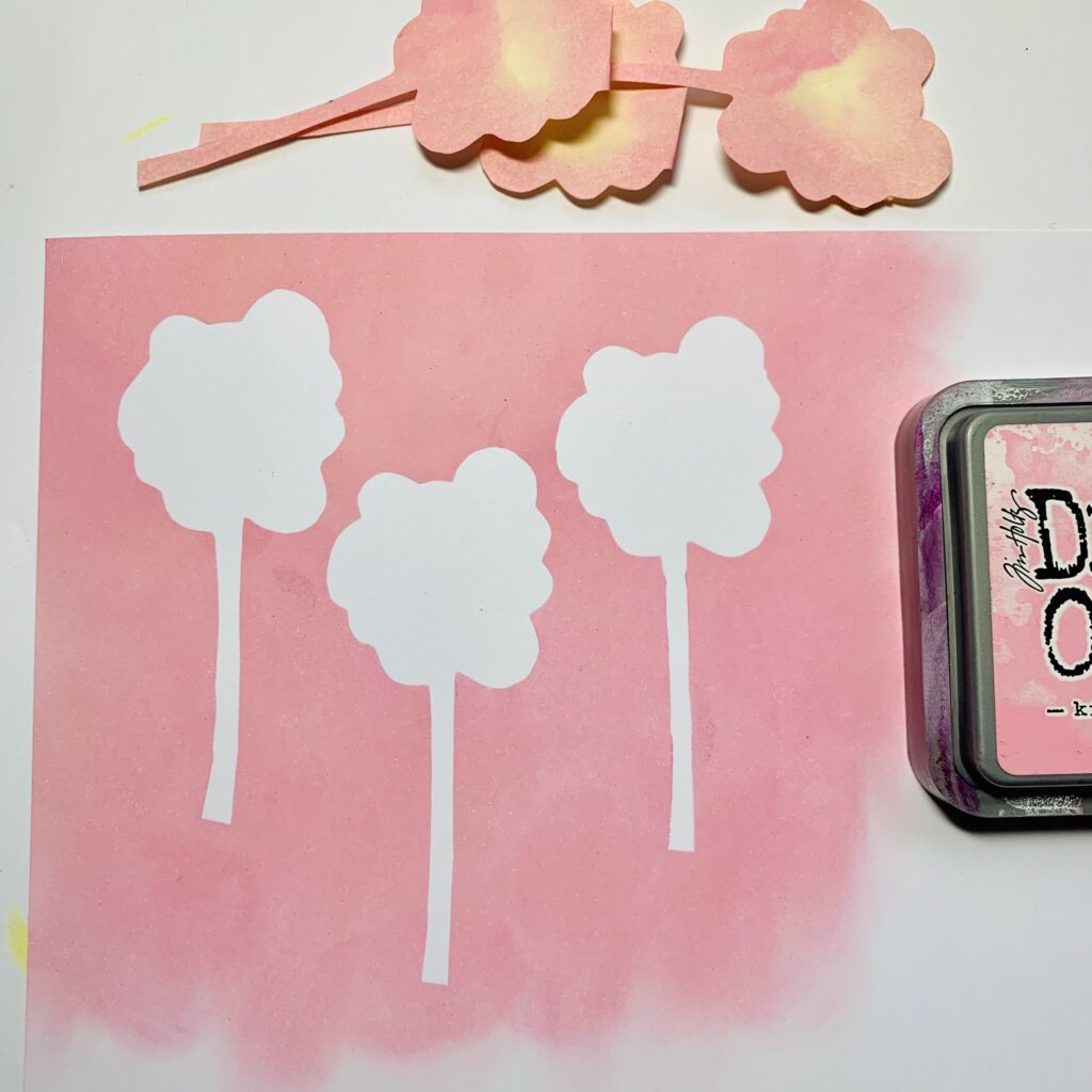You start with making a mask from the flowers and stick them on the white paper. With pink Distress ink oxide and a sponge you color the background.