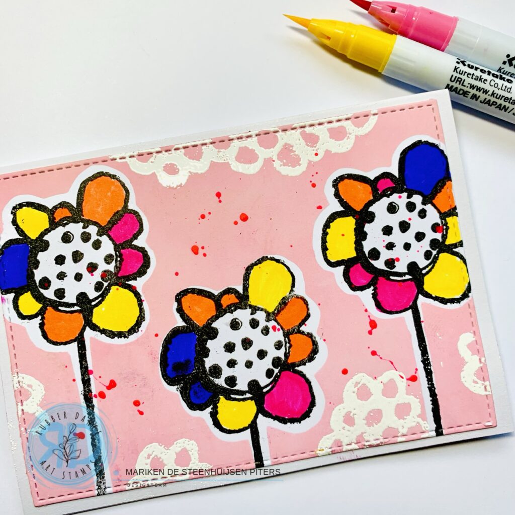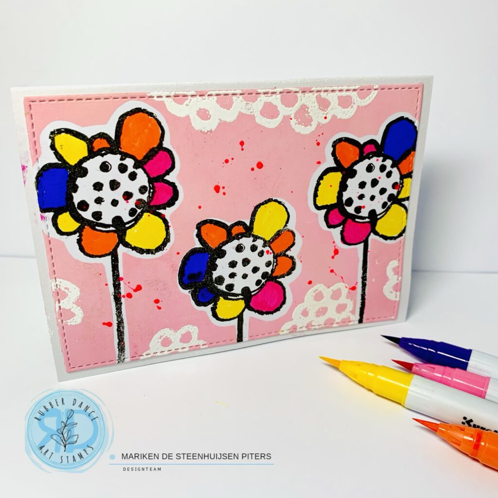 Hi there, Mariken here, with a tutorial making this simple and colorful flowercard using my favorite stamp Pencil Marks #4. Follow the pictures and you can see and read how I made this card.