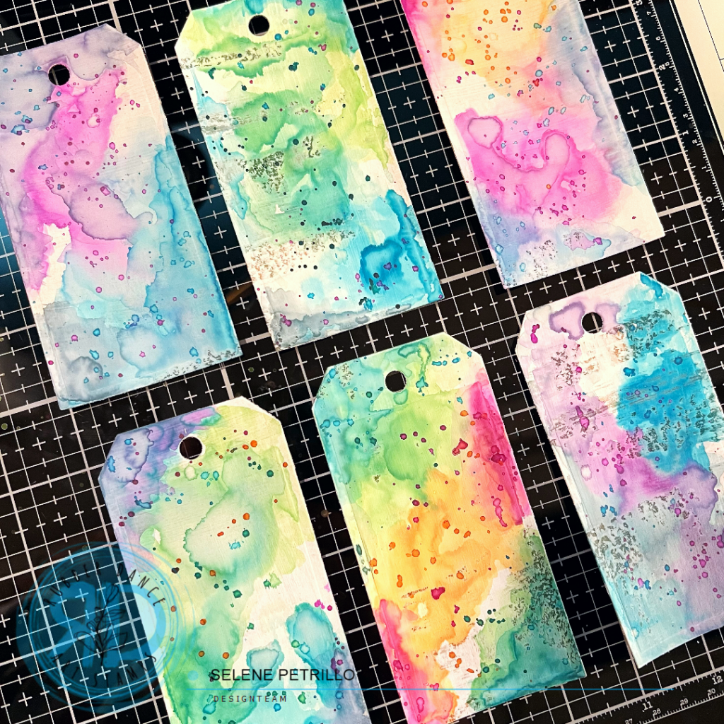 I die-cut 6 tags out of it and then I spread water and calligraphy inks by Hamburg Ink on this base. Hamburg Inks are fabulous as they super pigmented, can be used as watercolours but they do not fade like watercolours do when they dry.