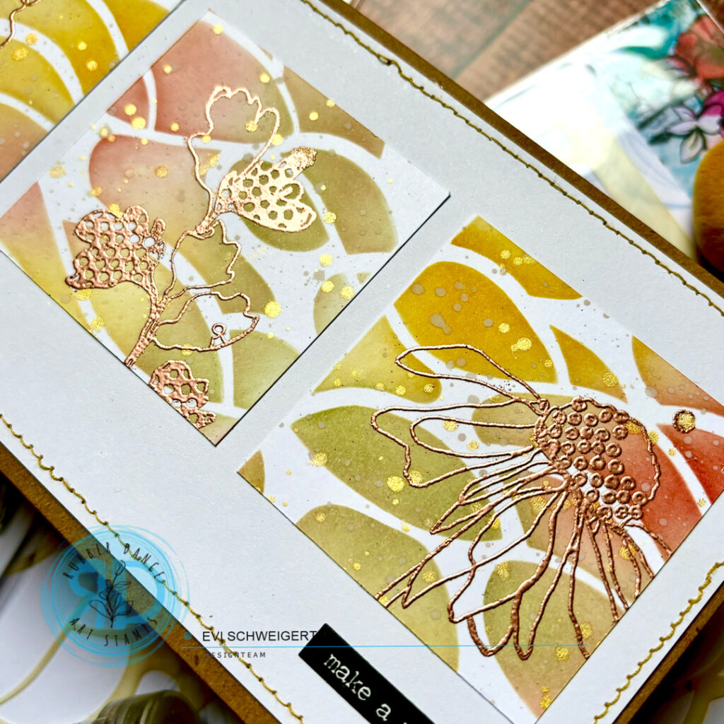 Hey, it’s Evi on the blog again with a slightly fancier autumn card for which I used the Organic 3 stencil and the Doodle Flower 2 stamp set together with metallic embossing powder.
