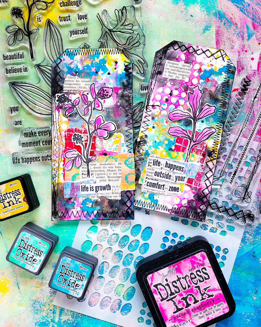 Hi there, Susanne here, showing you two layered mixed media tags with our new Collage Leaves 3 stamp set. I used Distress Inks and Oxides together with our new Mini Textures stencil for the background. All new stamps and stencils will be 10% off until Sunday, October 26th 2025.