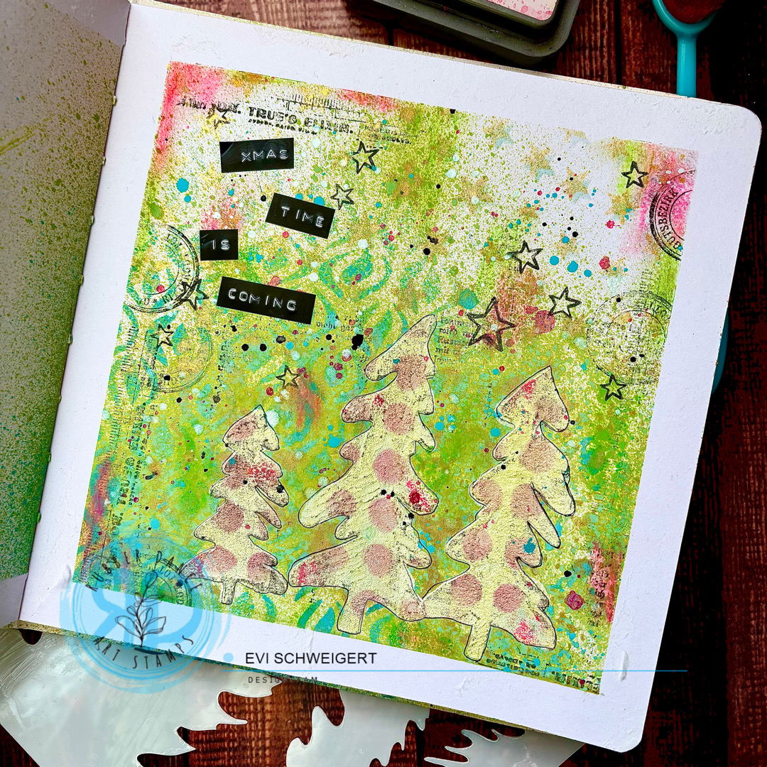 Hey there, it’s Evi on the blog today with a Tutorial for an Art Journal Page using the Ornament 1 and Stars 1 stencils for the background and trees made with XMas Trees 1 . It was jazzed up with a few stamps.