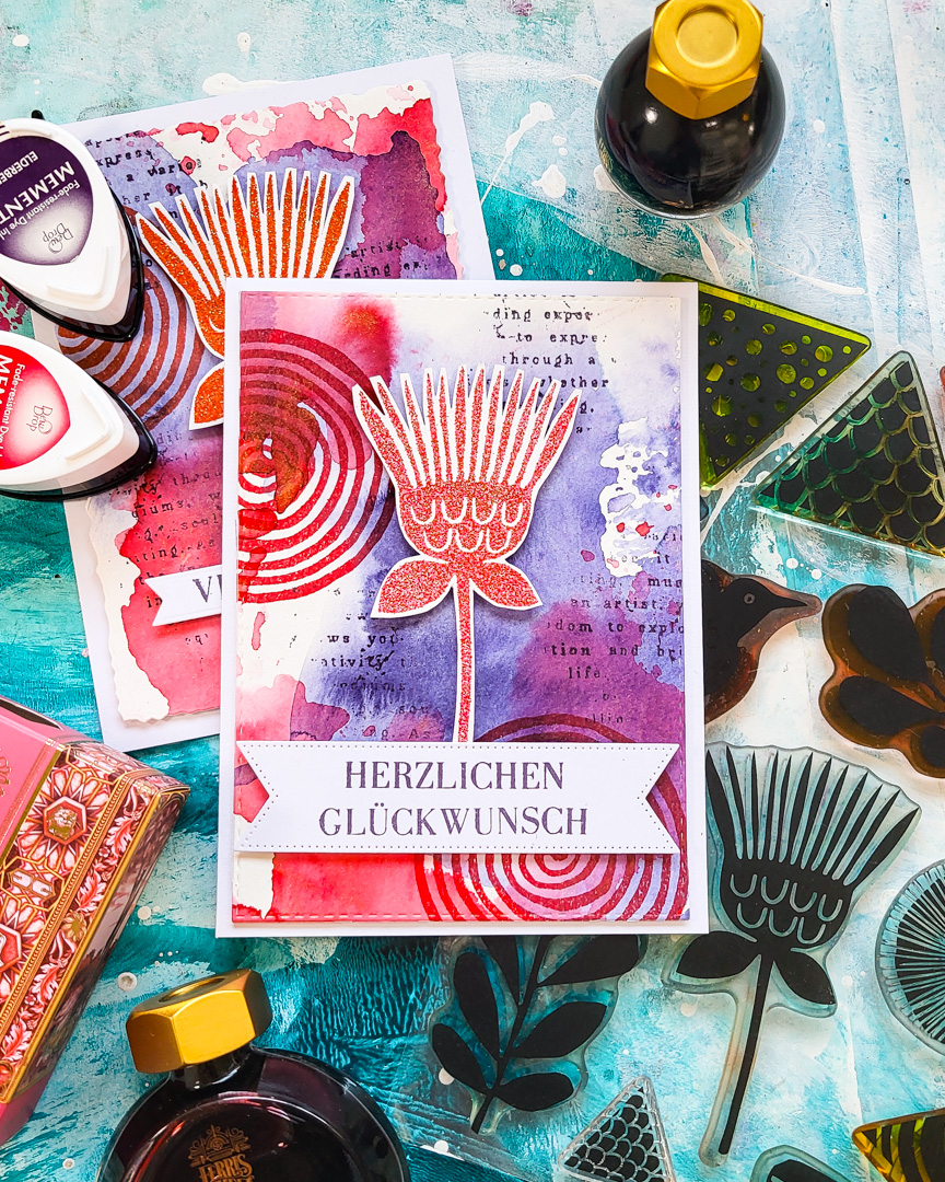 Hi there, Susanne here sharing a Birthday card with an inky background, made with inks on the gelli plate, and stamps from our Inky Flowers and Kartengrüße stamp sets.