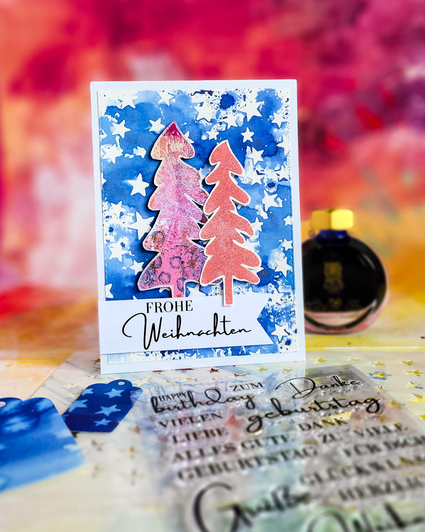 Hi there, Susanne here sharing my first Christmas card this year. I’ve been playing with our Stars and XMas Trees stencils! And you will get a little sneak peek on our upcoming release 😉