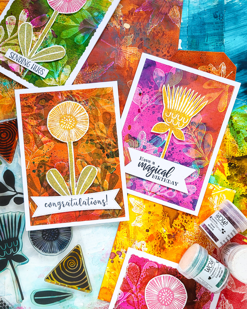 Hi there, Susanne here sharing some bright greeting cards using layered gelli prints (tutorial is linked in the post) together with images from our Carved Collection 6 stamp set.