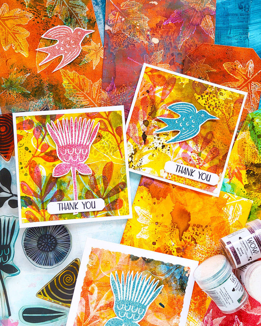 Hi there, Susanne here some autumnal “Thank You” cards using layered gelli prints (tutorial is linked in the post) together with images from our Carved Collection 6 stamp set.