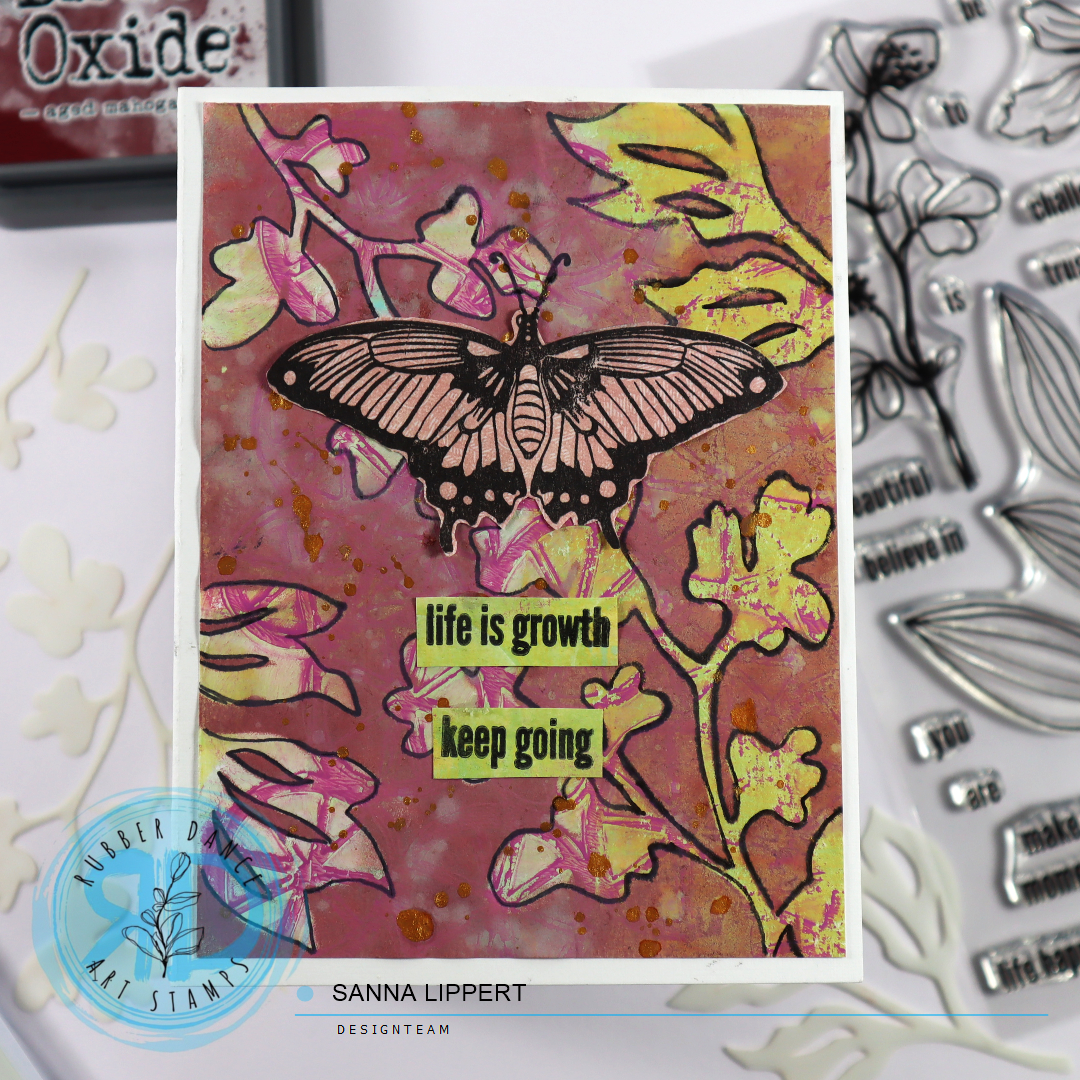 Hello, it´s Sanna here with a masked card background idea and step-by-step tutorial. I used the Butterflies and Moths stamp set, the new Sketchy Leaves 7 stencil and words from Collage Leaves 3 for this card project.