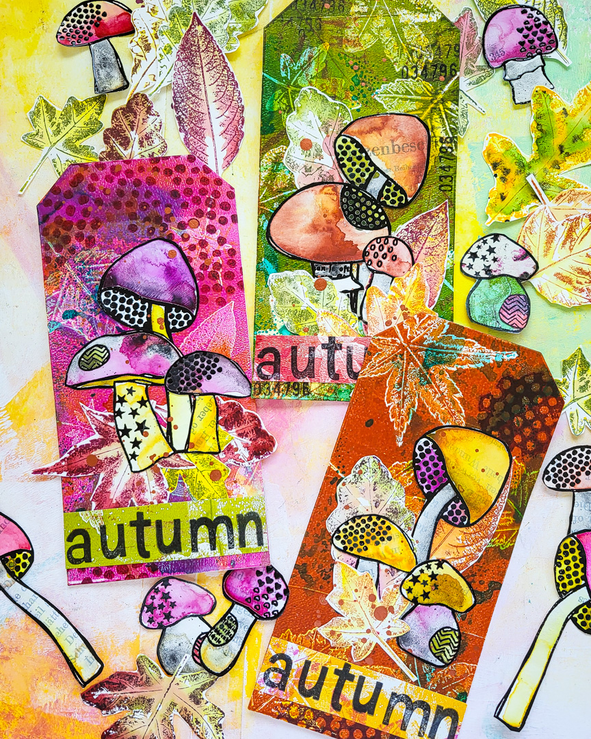 Hi there, Susanne here sharing a trio of autumnal mixed media tags using gelli prints (video linked in this post) combined with stamps from Textured Mushrooms and Autumn Leaves.
