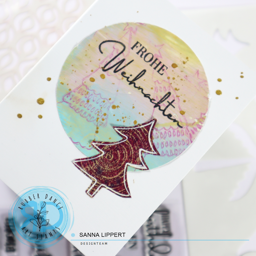 Hello, it´s Sanna here again today with another clean and simple card Christmas card share. For these cards I used some gelli printed collage papers, the XMas Trees 2 stencil and the Kartengrüße stamp set. For the collage paper I had used the Textured Xmas Trees 2 and the Mix It Up 4 stamp set.