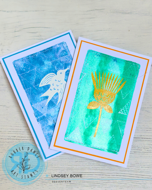 Lindsey (doodlings_cards) here with some some inspiration with 2 quick and easy greeting cards using backgrounds made with a mini 6″ x 4″ Gelli Plate and the Carved Collection 6 stamp set.