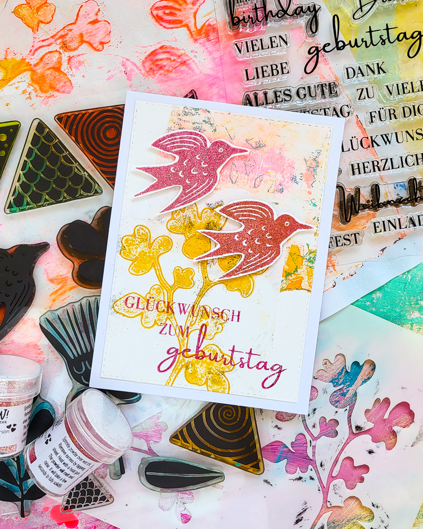 Hi there, Susanne here with a card making project using some of my gelli papers I shared in one of my recent videos, combined with the cute bird from Carved Collection 6 and a greeting from Kartengrüße.