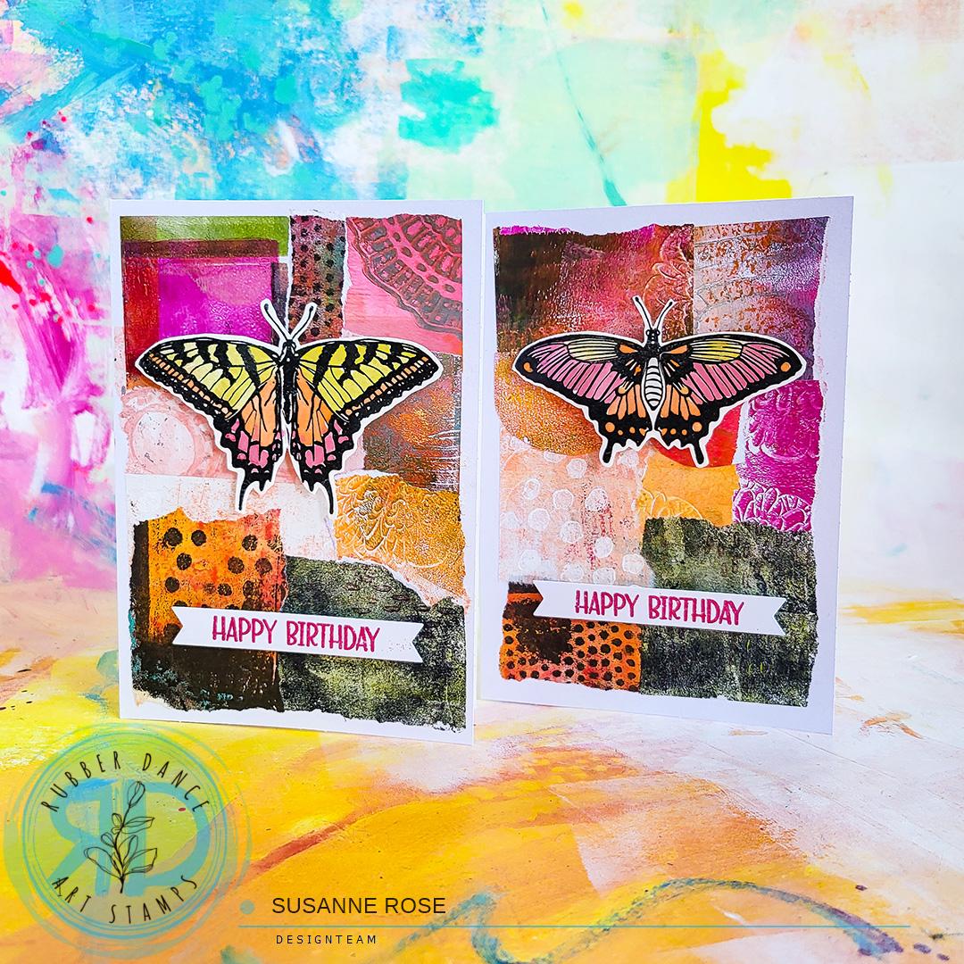 Hi there, Susanne here sharing a greeting card using stamps from our new Butterflies and Moths on a Distress Ink stencil background with our Marks 3 stencil. Click continue for a quick instruction video.