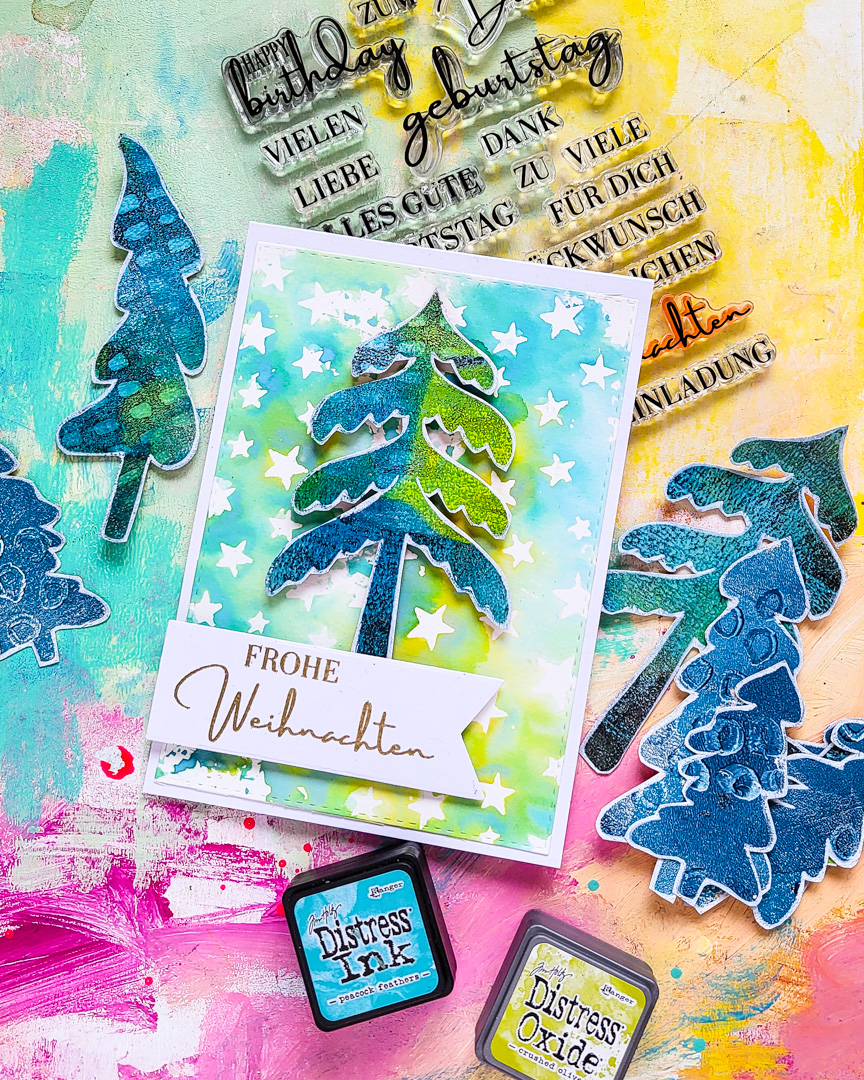 Hi there, Susanne here sharing another Christmas card. I’m playing with our Stars and XMas Trees 2 stencils. The background is made with Distress Inks and the tree is created with a gelli print!