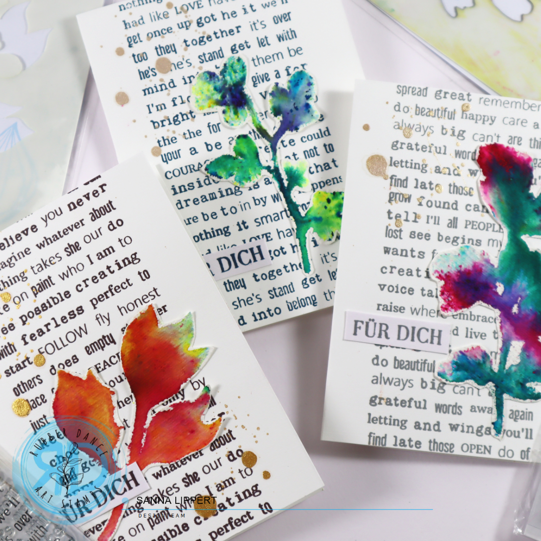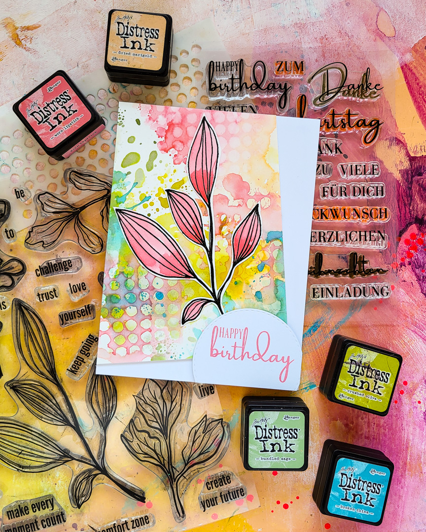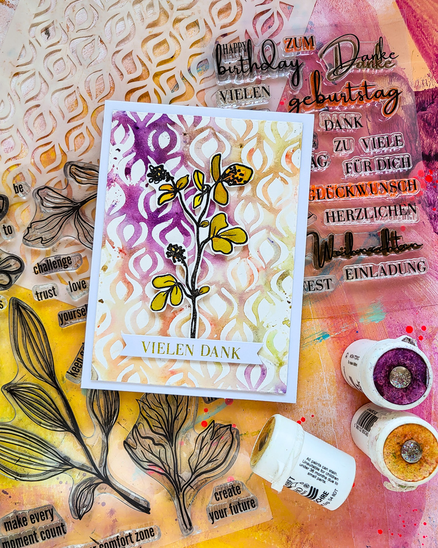 Hi there, Susanne here sharing a greeting card with a stencil background using Brusho pigment powders with our Ornament 1 stencil together with a stamp from Collage Leaves 3 and a greeting from Kartengrüße.