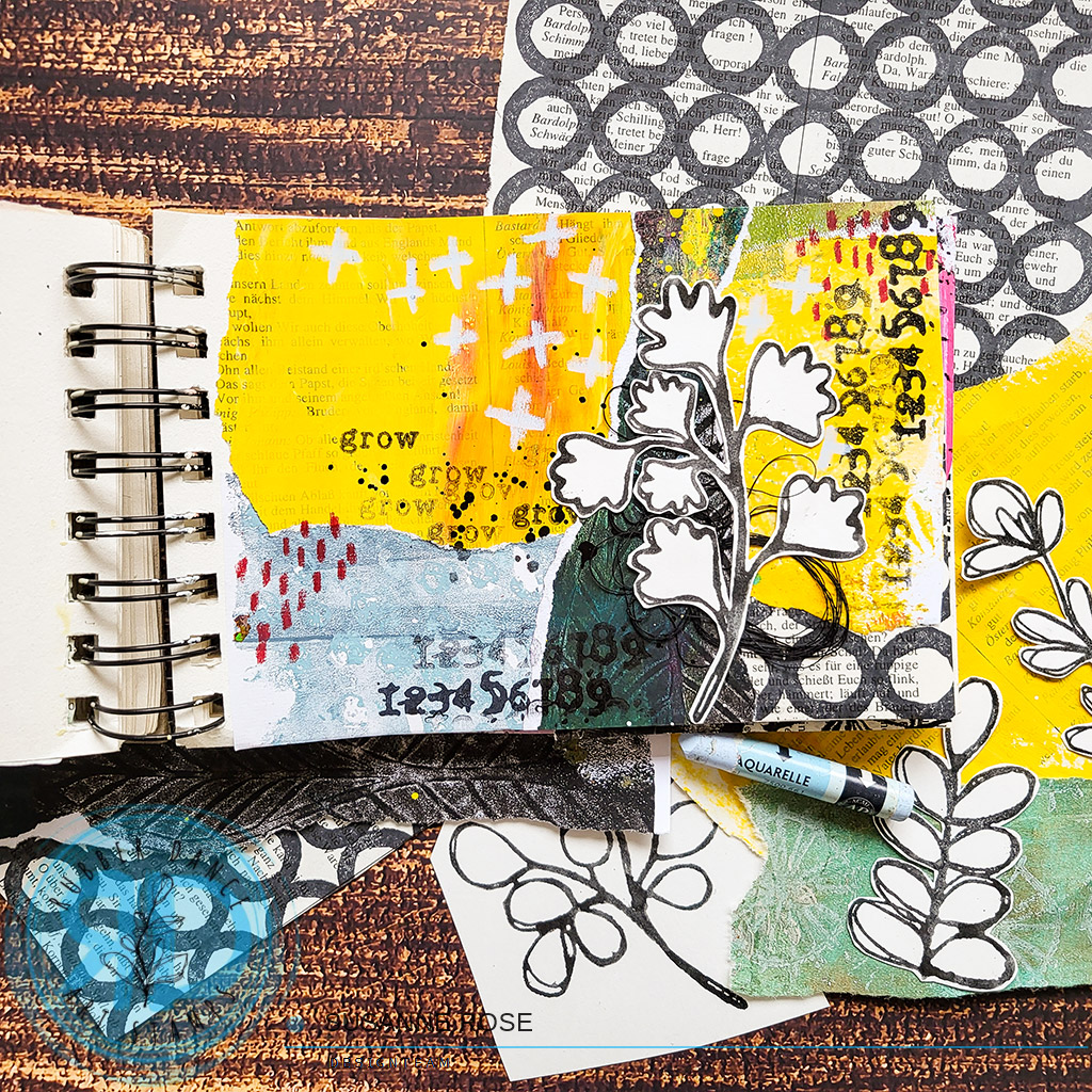 Hi there, Susanne here with a fun idea on how to store or gift your handmade collage fodder! I am making a little pocket folder with one of my gelli prints. If you don’t have a gel print you can, of course, use any kind of design paper or even a blank piece of card stock. Scroll down for a process video. Click continur for a process video.