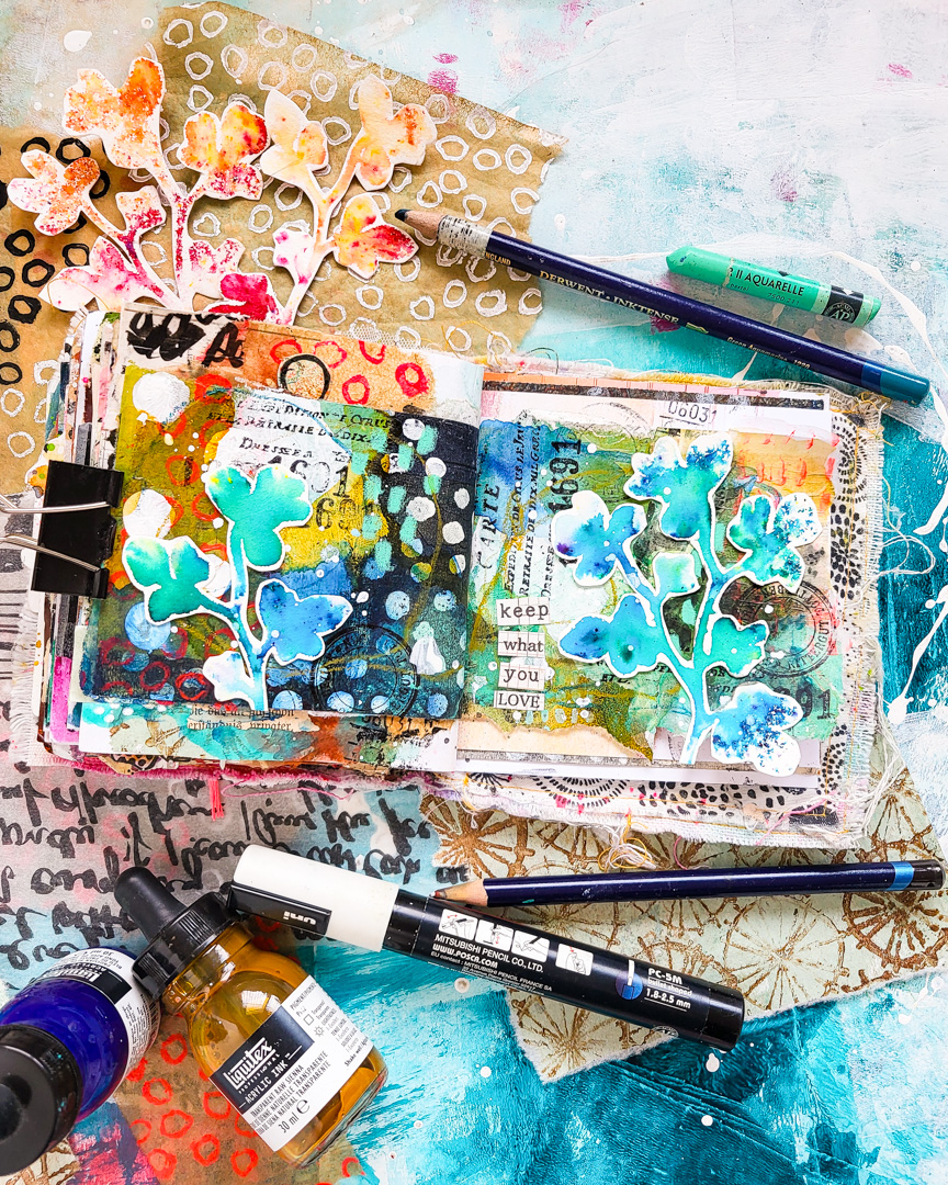 Hi there, Susanne here sharing a spread in my handmade junk art journal! I had a messy play with inks, collage and different mark making. I am using a focal image made with our Sketchy Leaves 7 stencil and Brusho pigment powders.
